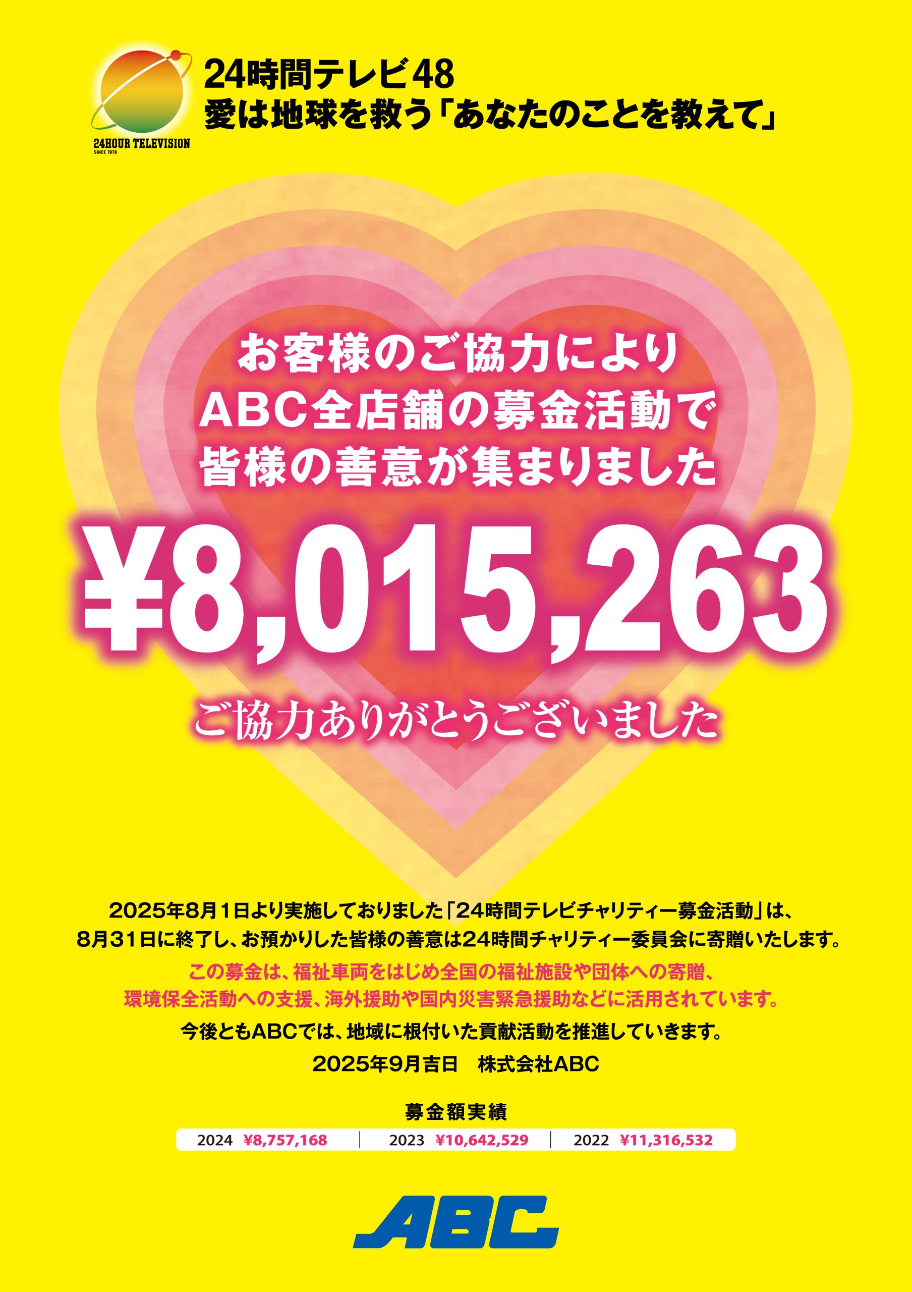 ご協力いただきました募金は、各県の日本テレビ系列24時間テレビチャリティー委員会に寄贈しました。